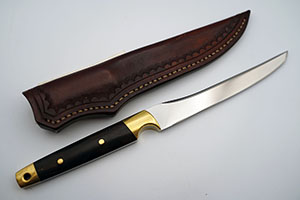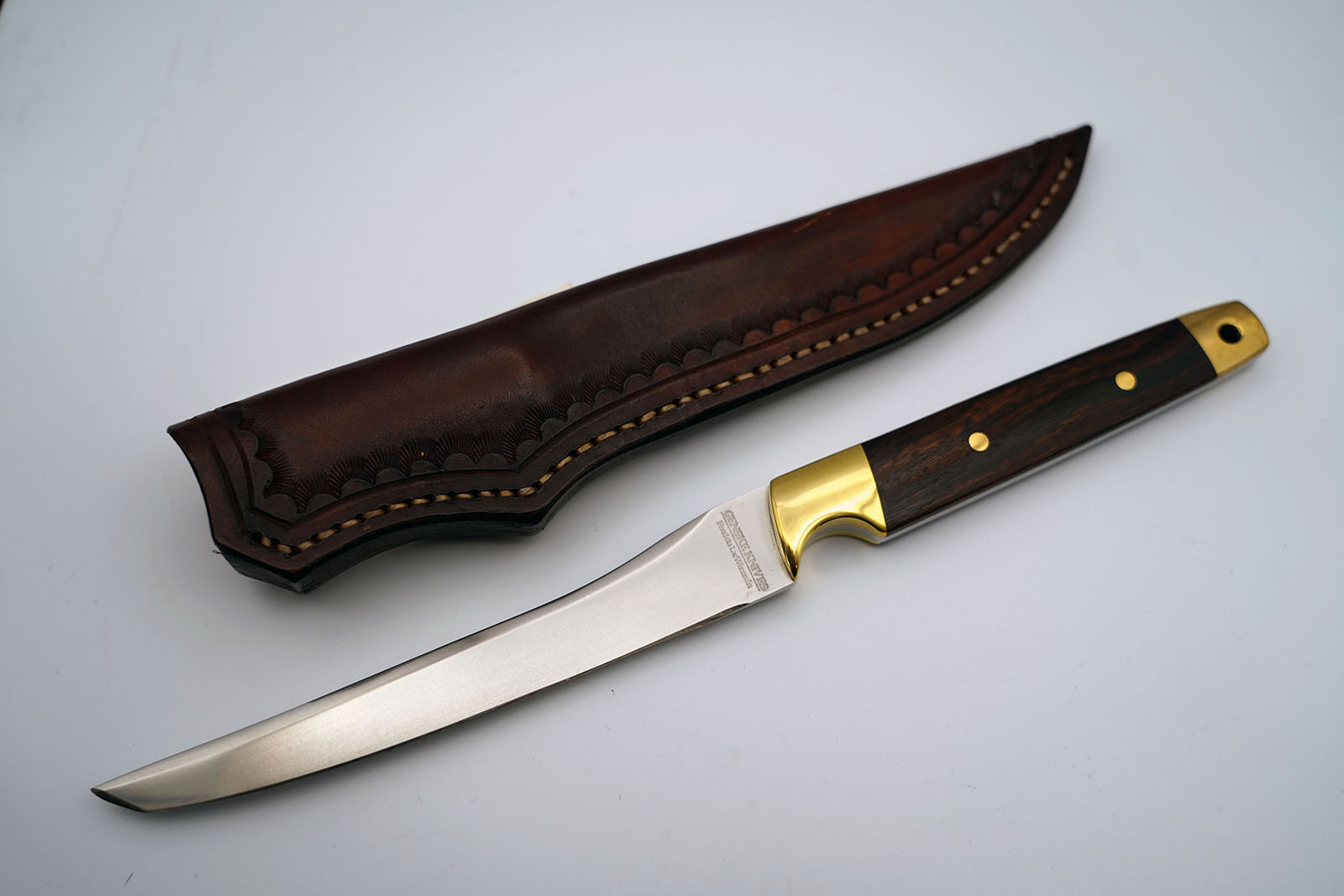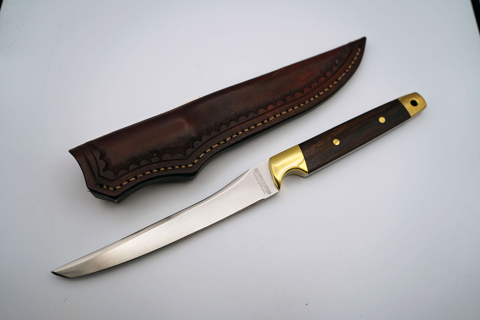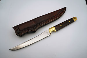 BRAND: JAY GENSKE MODEL: TANTO KNIFE (#177) PRICE: $425.00 BLADE LENGTH: 6.5" HANDLE: DESERT IRONWOOD SHEATH: LEATHER
