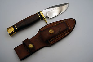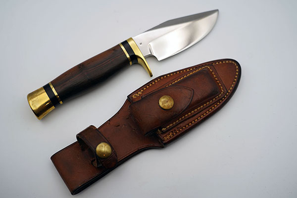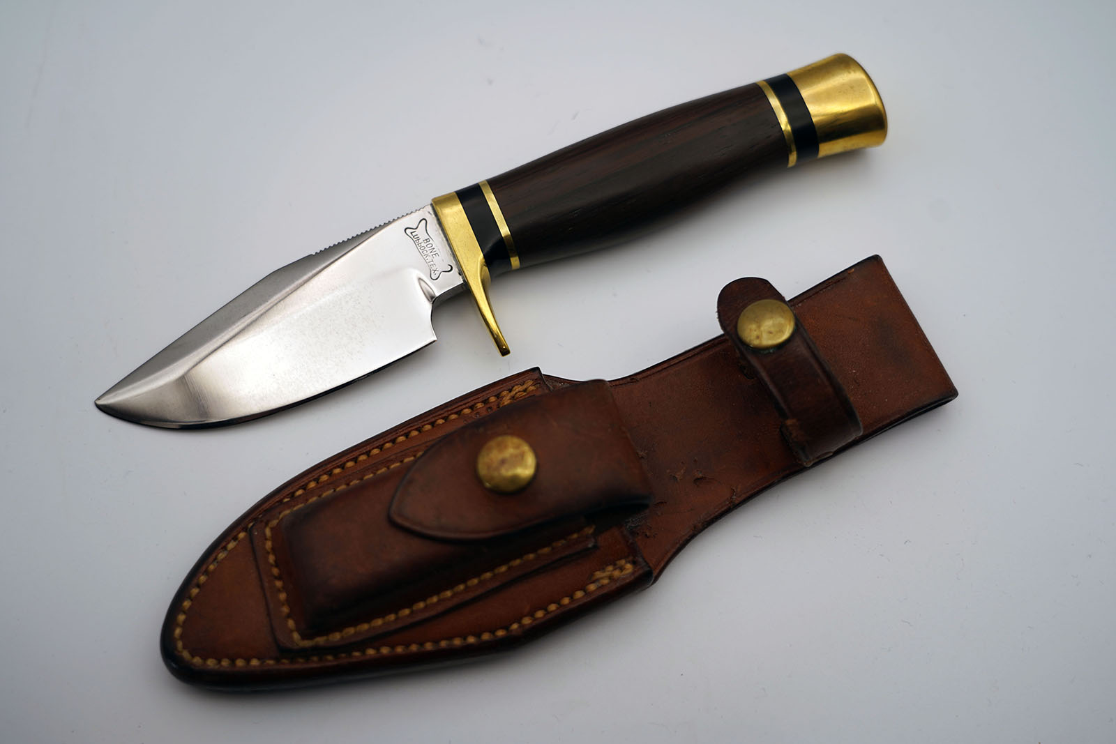 Ralph Bone made his first knife at the age of 9. He made knives from crosscut saw blades and leaf springs. He took a knife making class in high school and in college, after the war, at the Colorado School of the trades. He trained Enedino DeLeon and George Stone. Some of his knives were sold thru the Orvis company, but they are still “Bone made”.