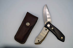 BRAND: BARRY WOOD MODEL : BARRY WOOD FOLDER #94 PRICE: $475.00 BLADE LENGTH: ??? HANDLE: WOOD SHEATH: LEATHER